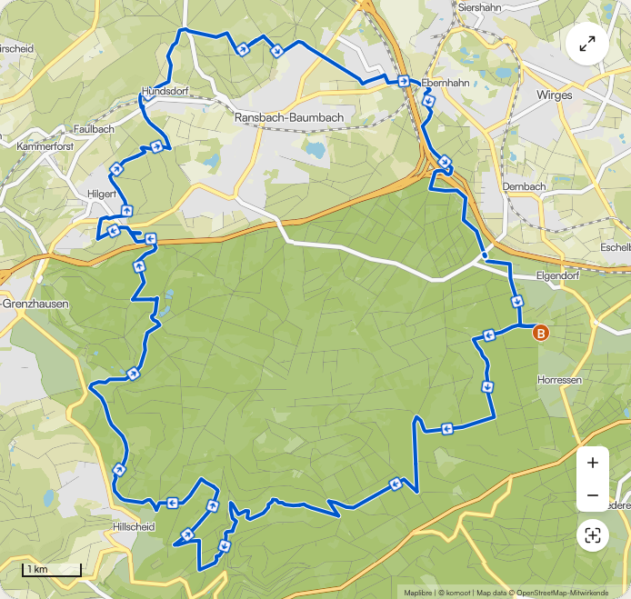 Der Start liegt im Bereich Horressen / Elgendorf. Von dort geht es zügig in die Wälder südlich von Ransbach-Baumbach. Die Tour verläuft größtenteils auf Forst- und Wirtschaftswegen, ergänzt durch kurze asphaltierte Abschnitte zwischen den Orten.