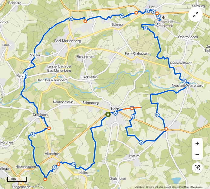 Start- und Zielpunkt ist EDEKA Höhn. Von dort führt die Route zunächst über ruhige Wege Richtung Neustadt/Westerwald und weiter nach Niederroßbach. Über offene Feld- und Waldpassagen geht es zum Flugplatz Hof, einem landschaftlichen Highlight mit weitem Blick.