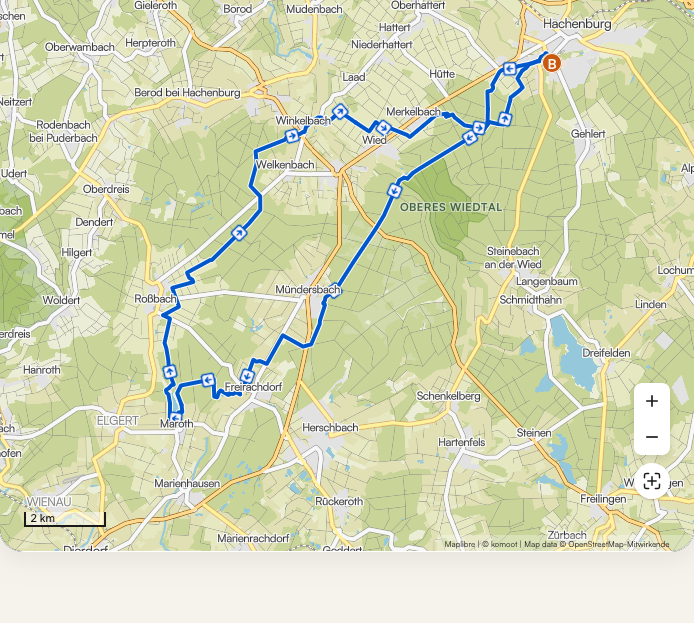 Start ist in Hachenburg. Von dort führt die Route zunächst westwärts über Merkelbach und entlang der Wied Richtung Winkelbach und Welkenbach. Die Strecke folgt ruhigen Nebenwegen, oft leicht wellig, mit viel Grün und wenig Verkehr.